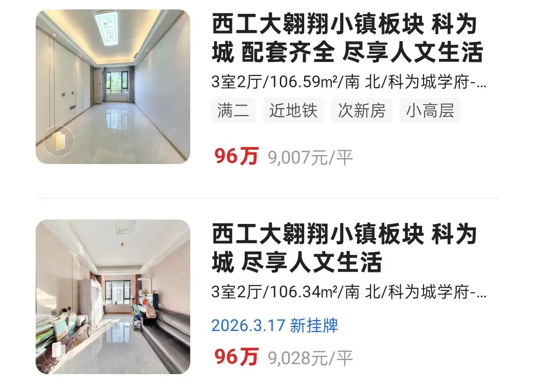 这些远郊区域二手房价格承接不足,购买者基本都是一些地缘性群体,或者一些自由职业人员。这些地区要想出售,一要靠机会,二要靠价格。说到远郊今天我们就看看,地处沣西新城翱翔小镇板块的科为城·学府。这个小区在2024年11月一套107㎡房源以总价110万成交,成交单价10276元,其后截止2025年4月其小区二手房成交单价都是9000加,根据公开数据显示从2025年4月之后小区再无成交房源。不过近期小区附近沣华九里有套房源成交,成交单价6900多。根据某壳显示,当前小区二手房挂牌最低单价9007元,这个挂牌价相比前两天沣华九里成交单价显然没有优势。