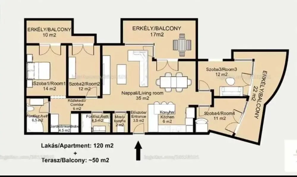 公寓室内面积约 120 平方米,另有总计约 50 平方米的露台,格局为客厅 + 4间卧室,双卫设计,空间宽敞舒适,居住体验非常好。