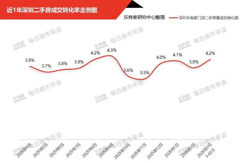 乐有家研究中心监测显示,截至3月23日,3月深圳乐有家门店的二手房带看成交转化率已攀升至4.2%,较2月提升0.3个百分点,较2025年11月的低点(3.5%)大幅提升0.7个百分点,达到近半年最高值。