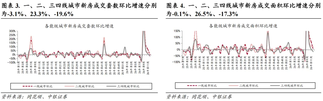 本周47个城市新房成交套数为2.8万套,环比下降3.5%、环比由正转负,同比下降11.3%、同比由正转负;新房成交面积为312.6万平方米,环比上升0.6%、环比增幅收窄,同比下降15.2%、同比由正转负。分城市能级来看,一、二、三四线城市新房成交套数分别为0.5、1.1、1.2万套,环比增速分别为-3.1%、23.3%、-19.6%,同比增速分别为-19.0%、-11.5%、-7.7%。一、二、三四线城市新房成交面积分别为50.1、135.4、127.2万平方米,环比增速分别为-0.1%、26.5%、-17.3%,同比增速分别为-17.7%、-8.6%、-20.3%。