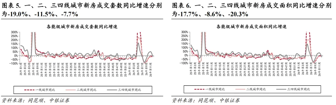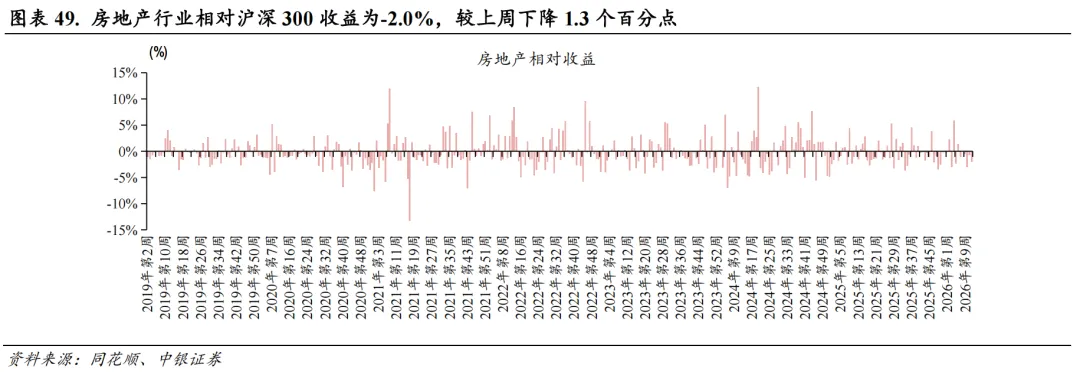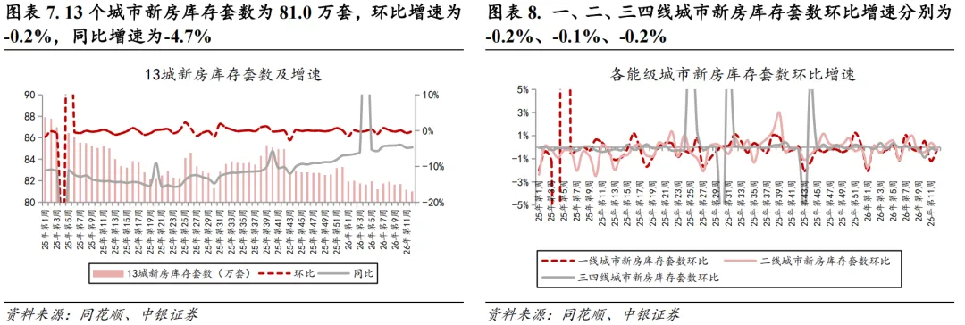 2)销售: 26年1-2月全国商品房销售面积同比下降13.5%,降幅较25年12月收窄了2.1个百分点,同比降幅虽然从25年11月以来持续收窄,但当前降幅仍然较大,仍需要关注3-4月的楼市成交情况。
