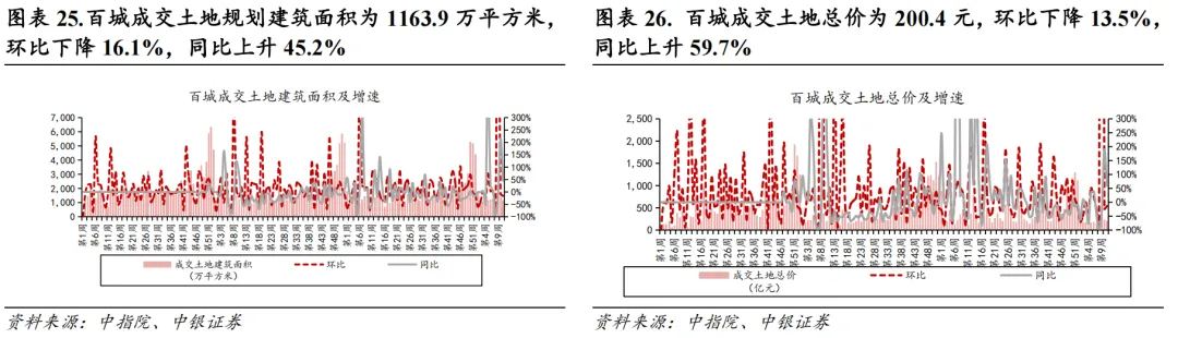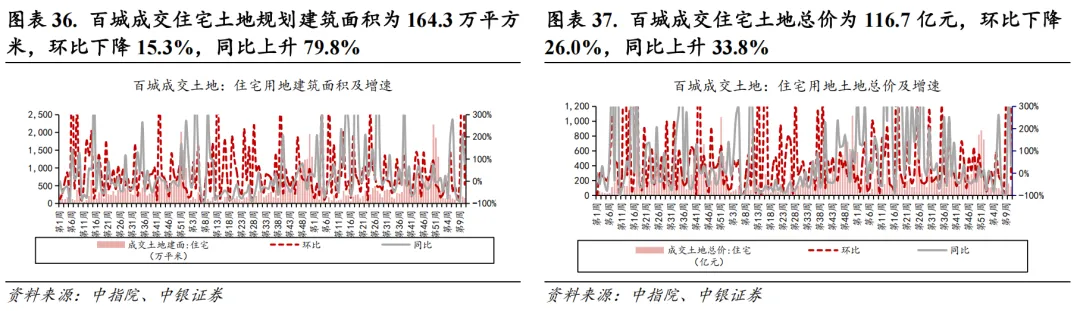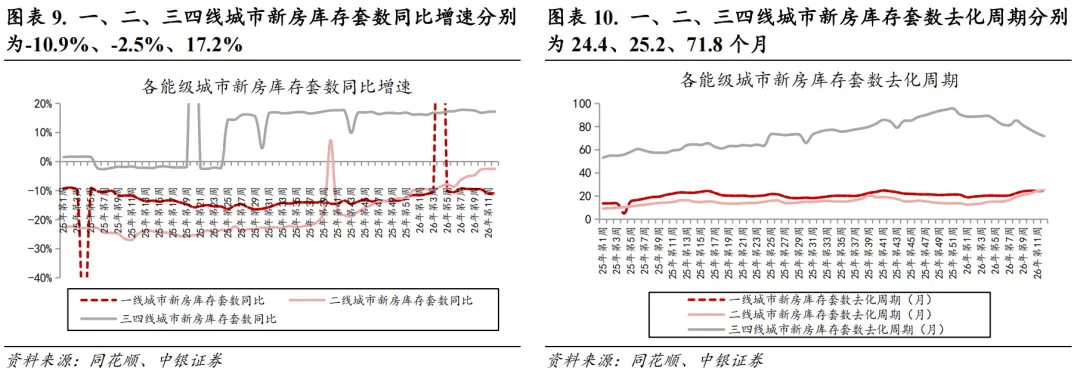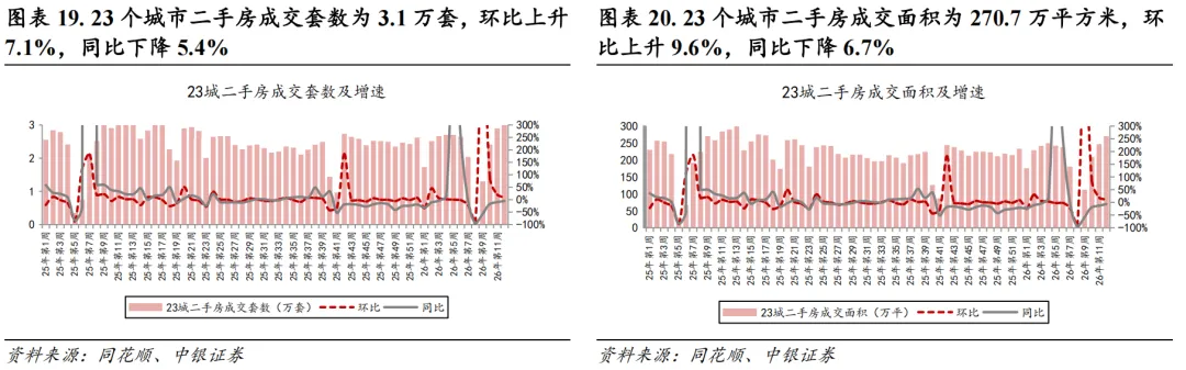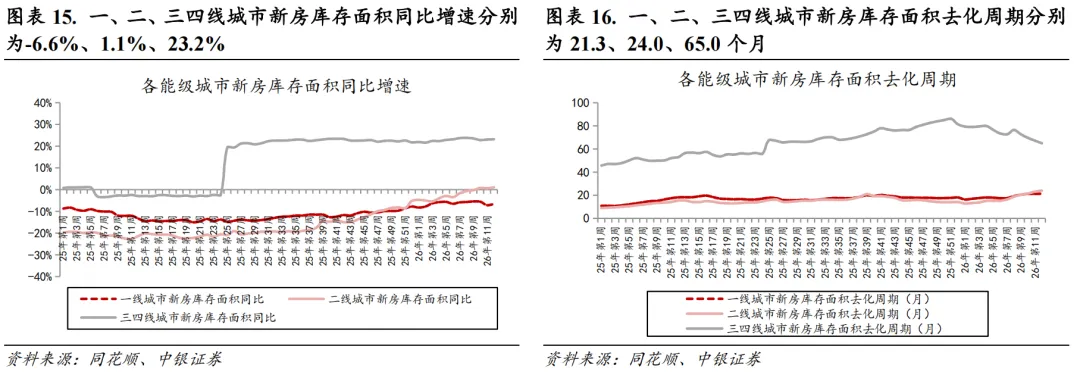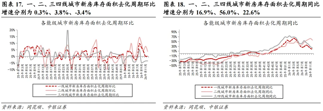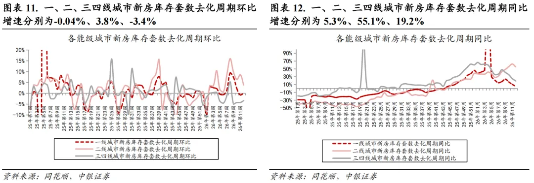 新房、二手房成交面积环比涨幅均收窄,新房同比由正转负、二手房同比降幅收窄;新房库存面积同环比均上涨;去化周期同环比均上涨。