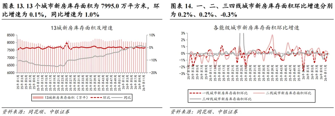 新房库存面积同环比均上涨;去化周期同环比均上涨。截至第12周末,13城新房库存面积7995.0万平,环比增速为0.1%,同比增速为1.0%;去化周期26.0个月,环比上升0.2个月,同比提升6.5个月。一、二、三四线城市新房库存面积去化周期分别为21.3、24.0、65.0个月,一、二线城市环比分别上升0.1、0.9个月,三四线城市环比下降2.3个月,一、二、三四线城市同比分别上升3.1、8.6、12.0个月。