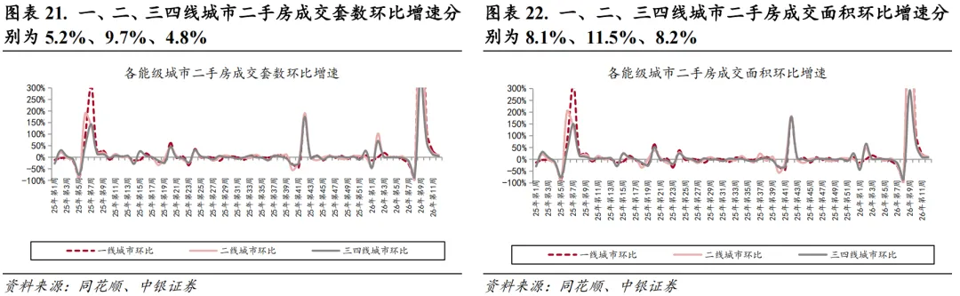 本周23个城市二手房成交套数为3.1万套,环比上升7.1%,同比下降5.4%;成交面积为270.7万平方米,环比上升9.6%,同比下降6.7%。从各城市能级来看,一、二、三四线城市二手房成交套数分别为1.3、1.4、0.4万套,环比增速分别为5.2%、9.7%、4.8%,同比增速分别为0.5%、-11.6%、0.1%;一、二、三四线城市成交面积分别为106.5、116.2、48.0万平方米,一、二、三四线城市环比增速分别为8.1%、11.5%、8.2%,同比增速分别为-2.5%、-12.4%、-0.2%。