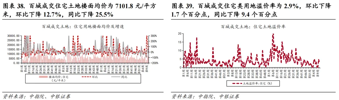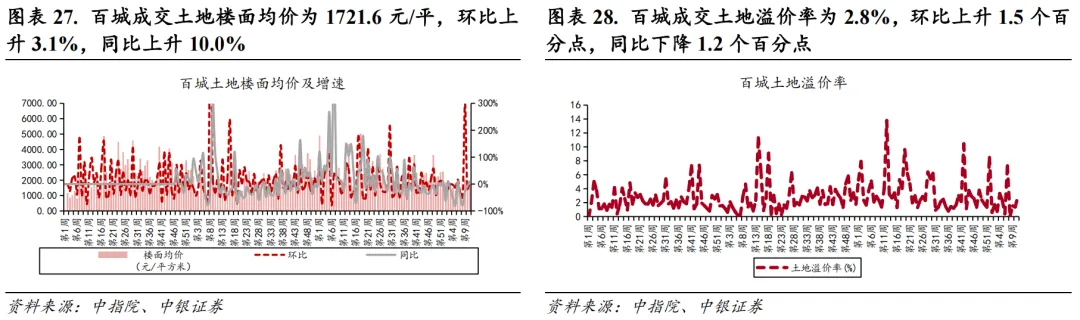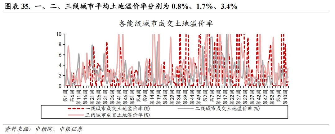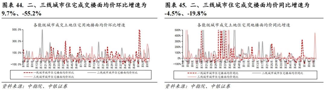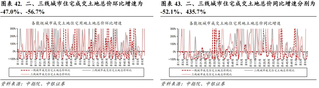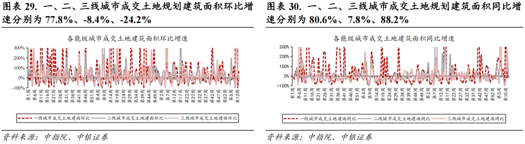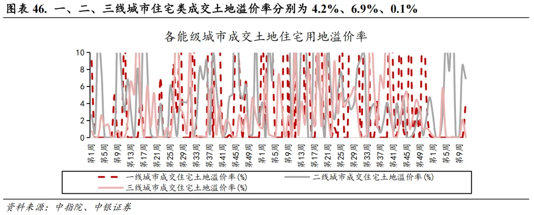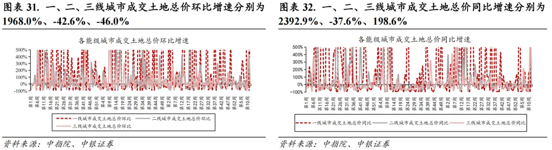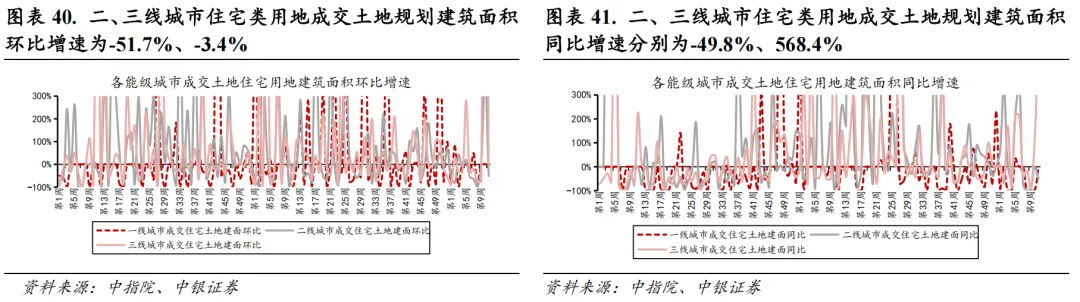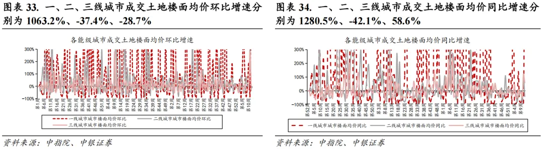 从不同城市能级的住宅类土地市场情况来看,本周一、二、三线土地建筑面积分别为14.3、37.4、112.6万平米,二、三线城市环比增速分别为-51.7%、-3.4%,二、三线城市同比增速分别为-49.8%、568.4%;一、二、三线城市住宅类成交土地总价分别为41.3、38.5、36.9亿元,二、三线城市环比增速分别为-47.0%、-56.7%,二、三线城市同比增速分别为-52.1%、435.7%;一、二、三线城市住宅类平均楼面价分别为28870、10287、3274元/平,二、三线城市环比增速分别为9.7%、-55.2%,二、三线城市同比增速为-4.5%、-19.8%;一、二、三线城市平均住宅类成交土地溢价率分别为4.2%、6.9%、0.1%,二、三线城市环比下降1.6、2.0个百分点,二、三线城市同比下降6.1、10.5个百分点。