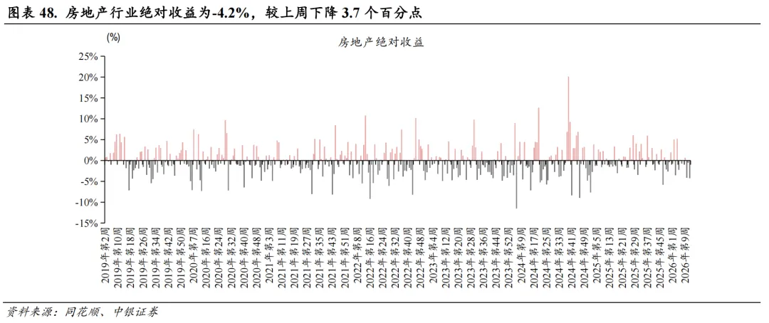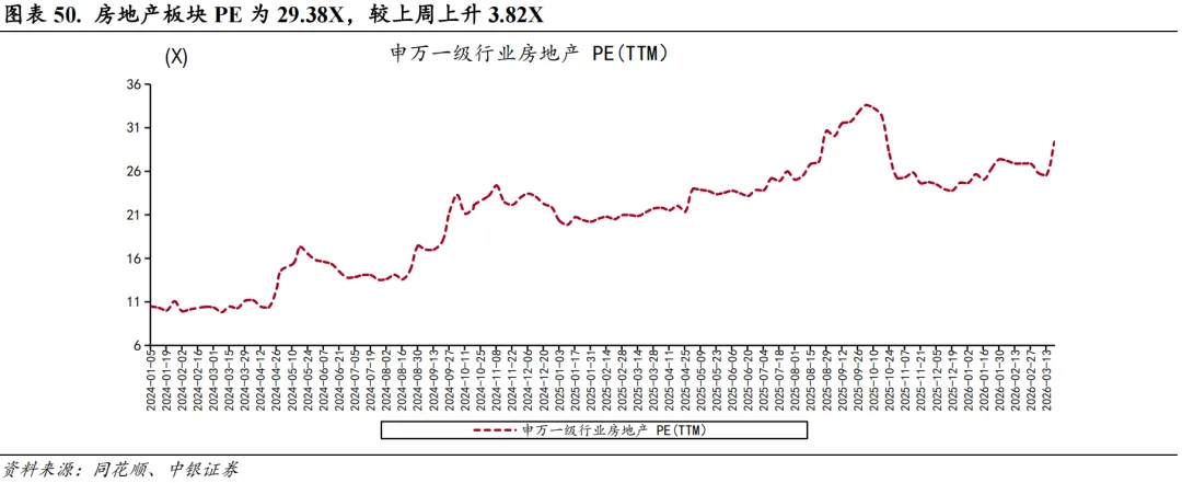 板块相对收益有所下降。房地产行业绝对收益为-4.2%,较上周下降3.7pct,房地产行业相对收益(相对沪深300)为-2.0%,较上周下降1.3pct。房地产板块PE为29.38X,较上周上升3.82X。
