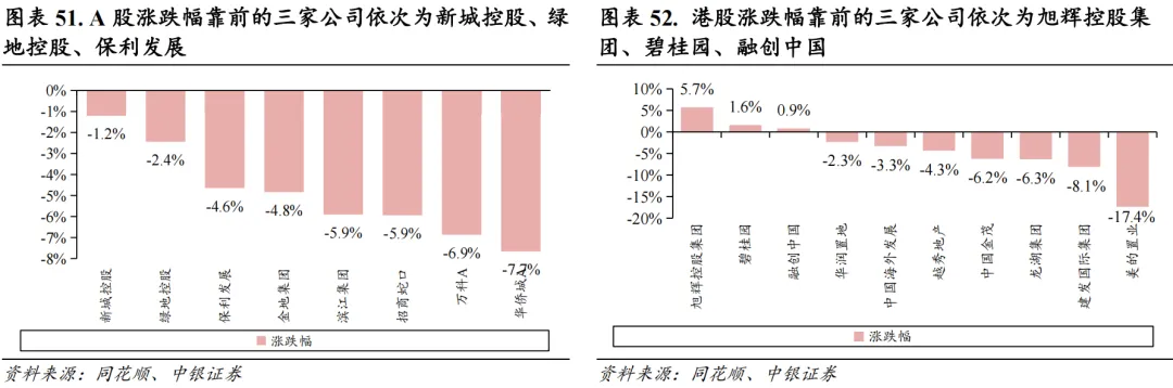 在我们重点跟踪房地产行业股票中,本周A股涨跌幅靠前的三家公司依次为新城控股、绿地控股、保利发展,涨跌幅分别为-1.2%、-2.4%、-4.6%,涨跌幅靠后的三家公司依次为华侨城A、万科A、招商蛇口,涨跌幅分别为-7.7%、-6.9%、-5.9%。港股涨跌幅靠前的三家公司依次为旭辉控股集团、碧桂园、融创中国,涨跌幅分别为5.7%、1.6%、0.9%,涨跌幅靠后的三家公司依次为美的置业、建发国际集团、龙湖集团,涨跌幅分别为-17.4%、-8.1%、-6.3%。