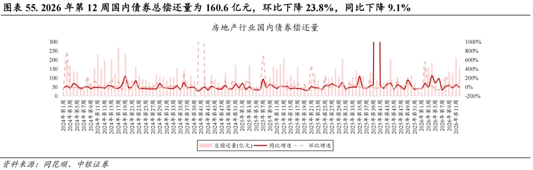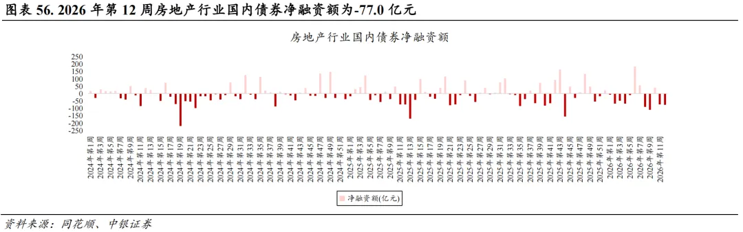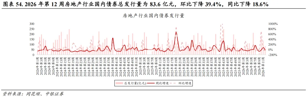 本周房企国内债券总发行量同环比均下降,总偿还量同环比均下降。2026年第12周(3月14日-3月20日)房地产行业国内债券总发行量为83.6亿元,环比下降39.4%,同比下降18.6%(前值:81.9%)。总偿还量为160.6亿元,环比下降23.8%,同比下降9.1%(前值:41.1%);净融资额为-77.0亿元。