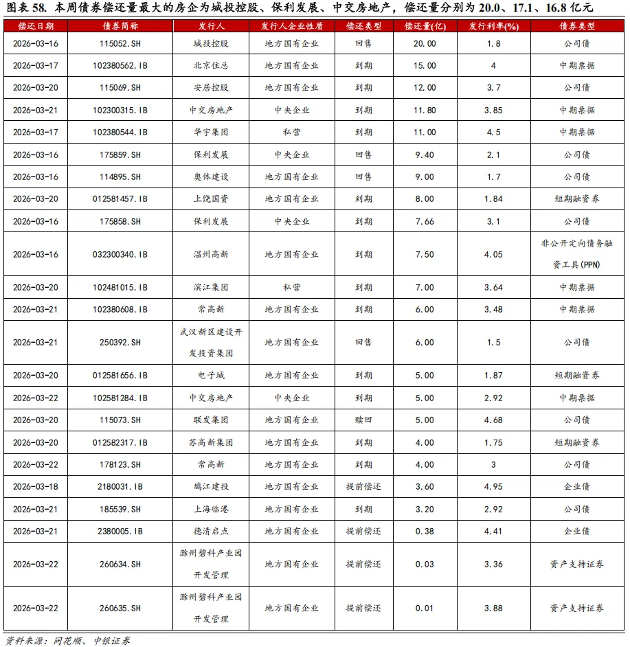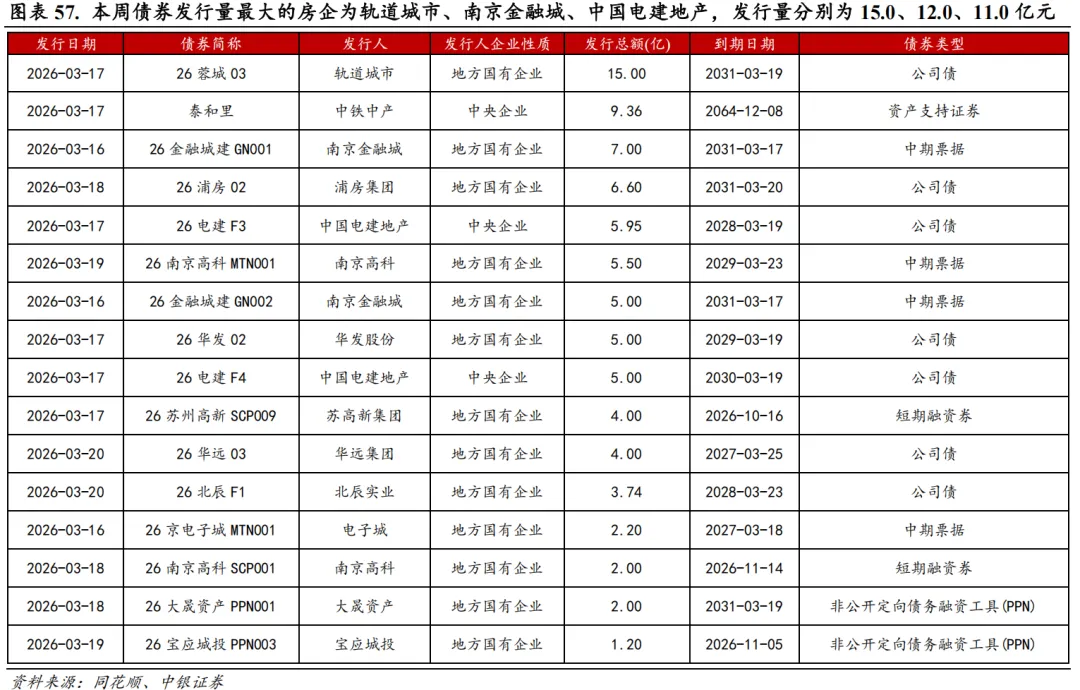 具体来看,本周债券发行量最大的房企为轨道城市、南京金融城、中国电建地产,发行量分别为15.0、12.0、11.0亿元。本周债券偿还量最大的房企为城投控股、保利发展、中交房地产,偿还量分别为20.0、17.1、16.8亿元。