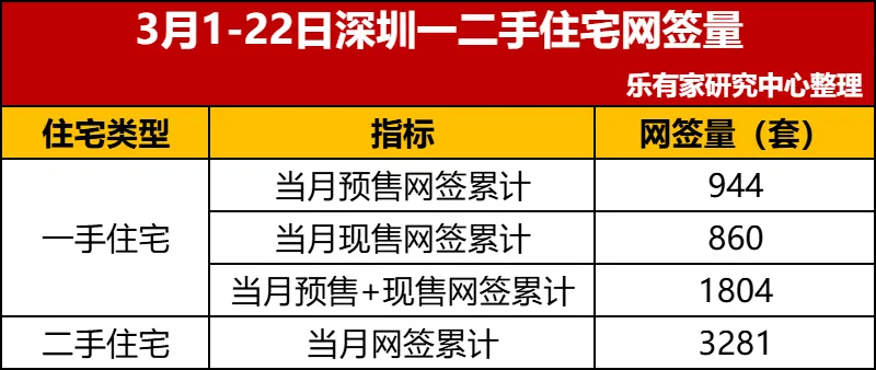 【深圳】截止到3月22日,本月一手住宅预售网签累计944套,现售网签累计860套,预售+现售网签累计1804套;本月二手住宅累计网签3281套。