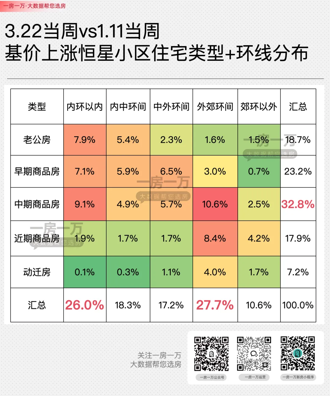 那么,这些率先止跌上涨的,究竟是哪些房子?当我把基价上涨的恒星小区,放到住宅类型+环线的网格上看,四个梯队的占比揭示了本轮修复行情的核心驱动力:1. 外郊环间中期商品房(占比10.6%):改善外溢的“领头羊”这类房源占比最高,成为本轮上涨的最大赢家。