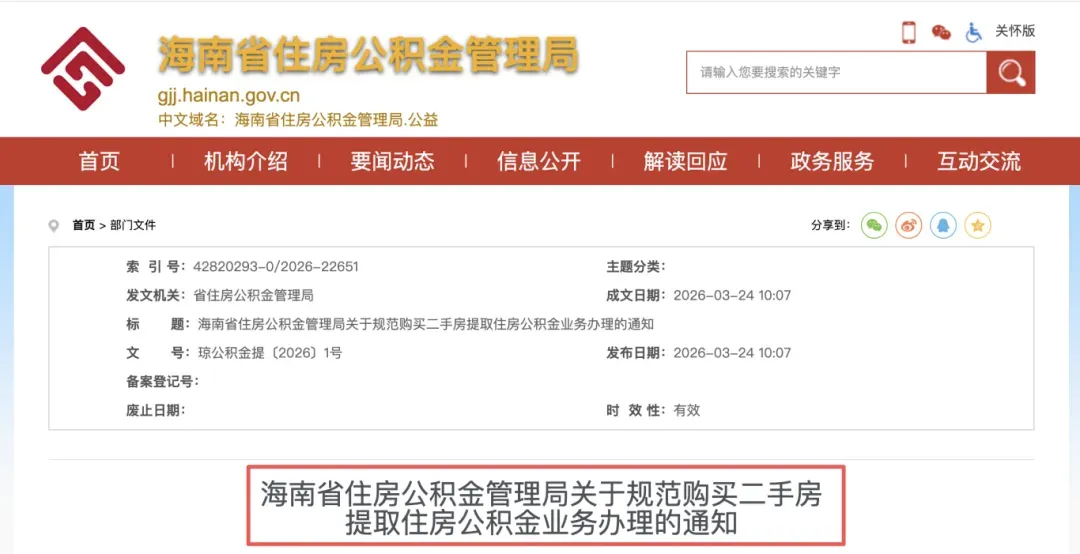 2026年3月24日,海南省住房公积金管理局正式发布《关于规范购买二手房提取住房公积金业务办理的通知》(琼公积金提(2026)1号),从提取时限、办理渠道、违规惩戒三方面明确全省二手房公积金提取规则,核心围绕精准支持刚需、改善,遏制炒房行为,让公积金真正“取之于民、用之于住”,新政自发布之日起即刻执行!