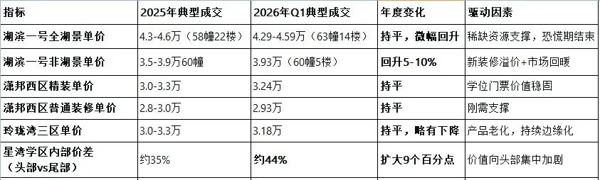 2. 星湾学区“头部企稳、尾部探底”格局固化:湖滨一号等品质盘已完成价值重估,玲珑湾三区等老旧产品将持续边缘化。