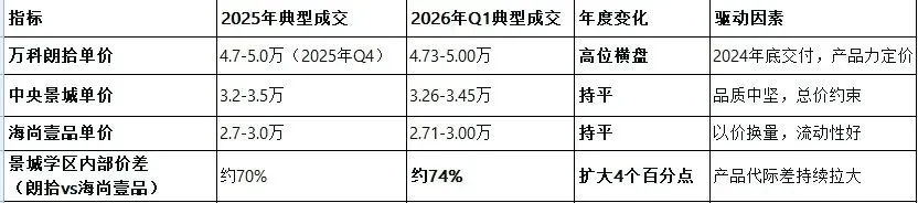 · 万科朗拾作为2024年底交付的次新盘,在2025年Q4至2026年Q1价格稳定在4.7-5.0万,成为景城网格的价格锚定者。