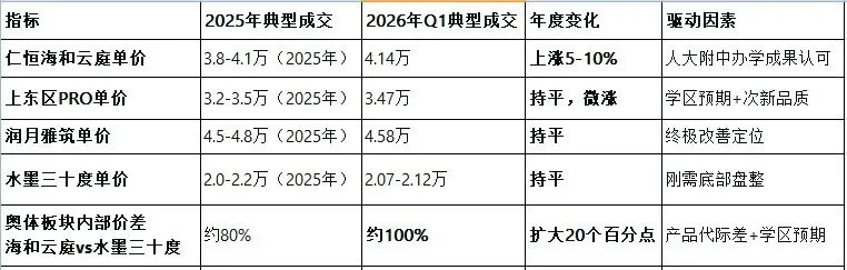 3. 奥体板块“预期兑现”:仁恒海和云庭(4.14万)、上东区PRO(3.47万)较2025年同期上涨约5%-10%,反映市场对人大附中办学成果的认可。