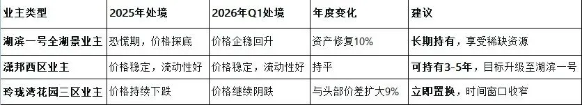 · 玲珑湾三区等老旧产品持续被边缘化,与湖滨一号的价差从2025年的35%扩大至44%,且趋势不可逆。