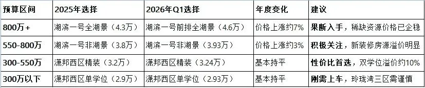 · 湖滨一号全湖景房源(4.3-4.6万)已站稳,较2024年底低点(3.8万)回升约10%,显示稀缺资源的价值韧性。