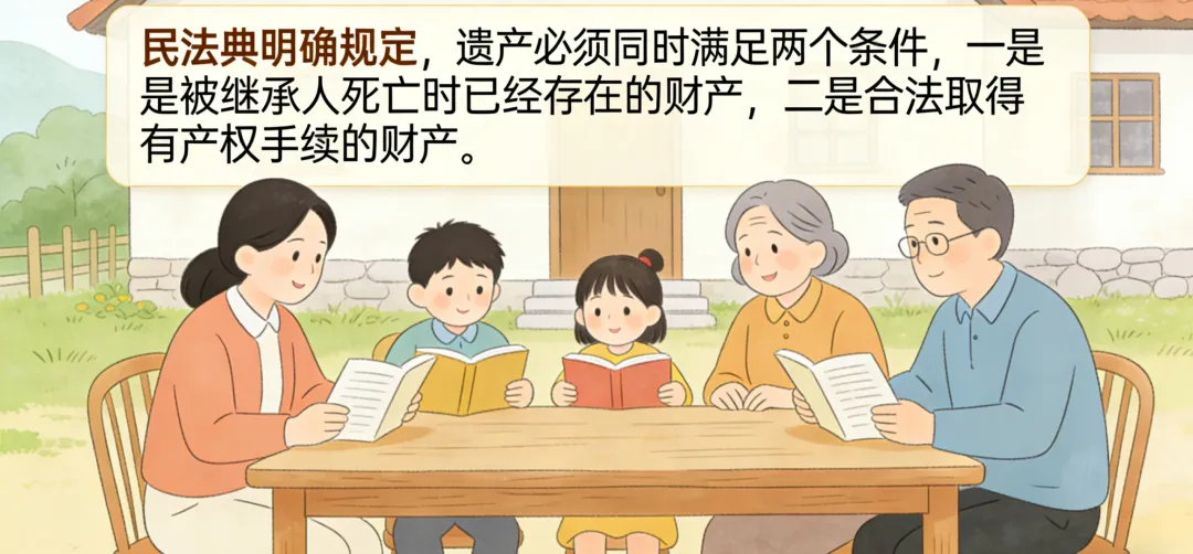 《民法典》明确规定,遗产必须同时满足两个条件:一是被继承人死亡时已经存在的财产;二是合法取得、有产权手续的财产。