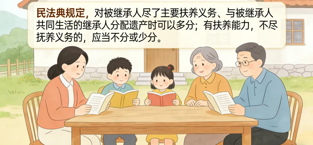 无遗嘱、无遗赠扶养协议时,按法定继承办理,第一顺序继承人包括配偶、子女、父母,份额一般均等。但《民法典》同时规定:对被继承人尽了主要扶养义务、与被继承人共同生活的继承人,分配遗产时可以多分;有扶养能力不尽扶养义务的,应当不分或少分。