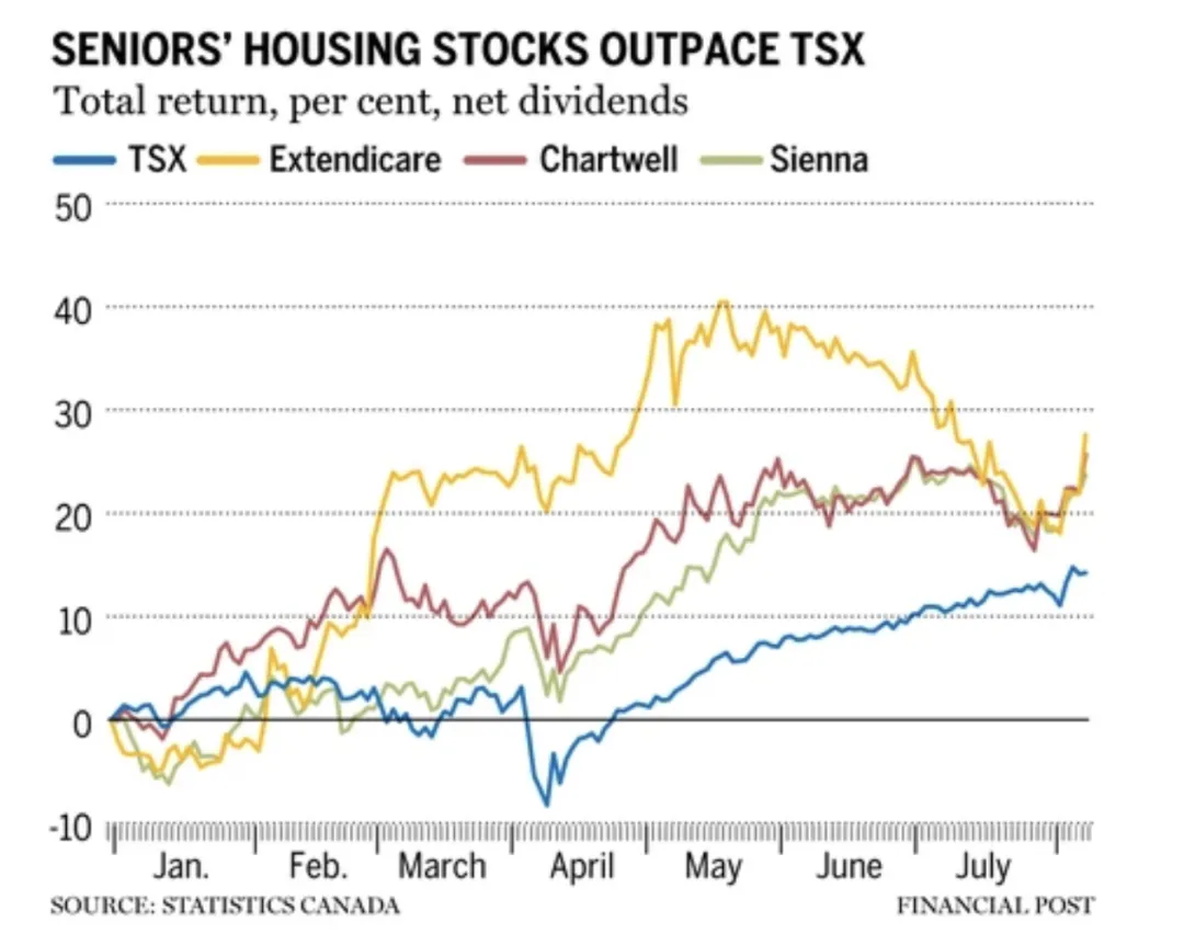 其中,SiennaSenior Living Inc.的股价上涨了19%,Chartwell Retirement Residences上涨了20%,ExtendicareInc.上涨了近21%。