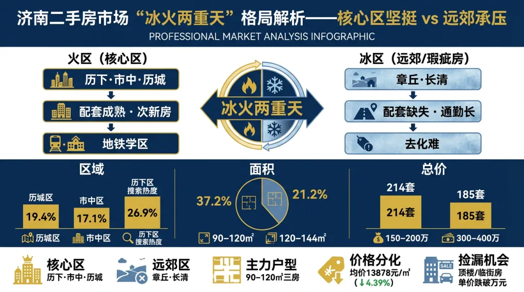 2025年至2026年初,济南二手房市场呈现明显的“冰火两重天”格局:主城区热度不减,远郊则持续承压。数据显示,历城区、市中区和历下区是成交的三大主力区域。历城区以17.47%至19.4%的成交占比稳居榜首。雪山、唐冶、济钢等次新片区因房龄短、配套成熟,成为刚需与刚改群体的首选。其中,雪山片区紧邻地铁2号线彭家庄站(已通车),唐冶片区拥有历城二中教育集团唐冶分校(公办九年一贯制),生活便利性显著提升。