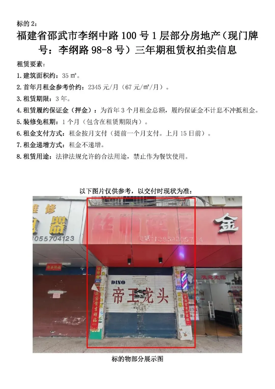 2.福建省邵武市李纲中路100号1层部分房地产(现门牌号:李纲路98-8号)三年期租赁权(出租建筑面积约35㎡)。