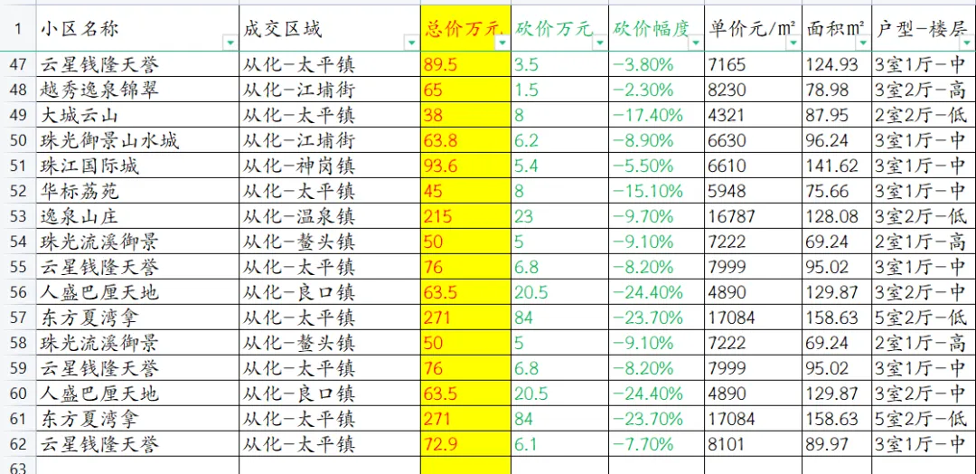 【广州楼市深度观察】从化区本次数据共覆盖61套成交房源。