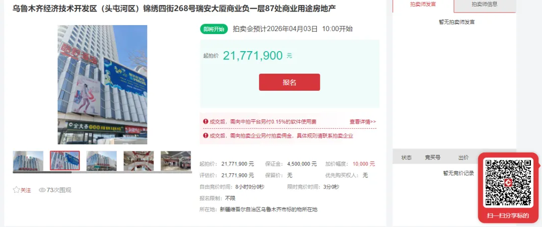 新疆瑞商房地产开发有限公司位于乌鲁木齐经济技术开发区(头屯河区)锦绣四街268号瑞安大厦商业负一层87处商业用途房地产进行公开拍卖,面积:3483.5㎡,修建年代:2017年12月,结构:钢混,其余详细信息见对应评估报告,具体以现状为准。起拍价:21771900元,保证金:4500000元,竞价阶梯:10000元及其整数倍/次。