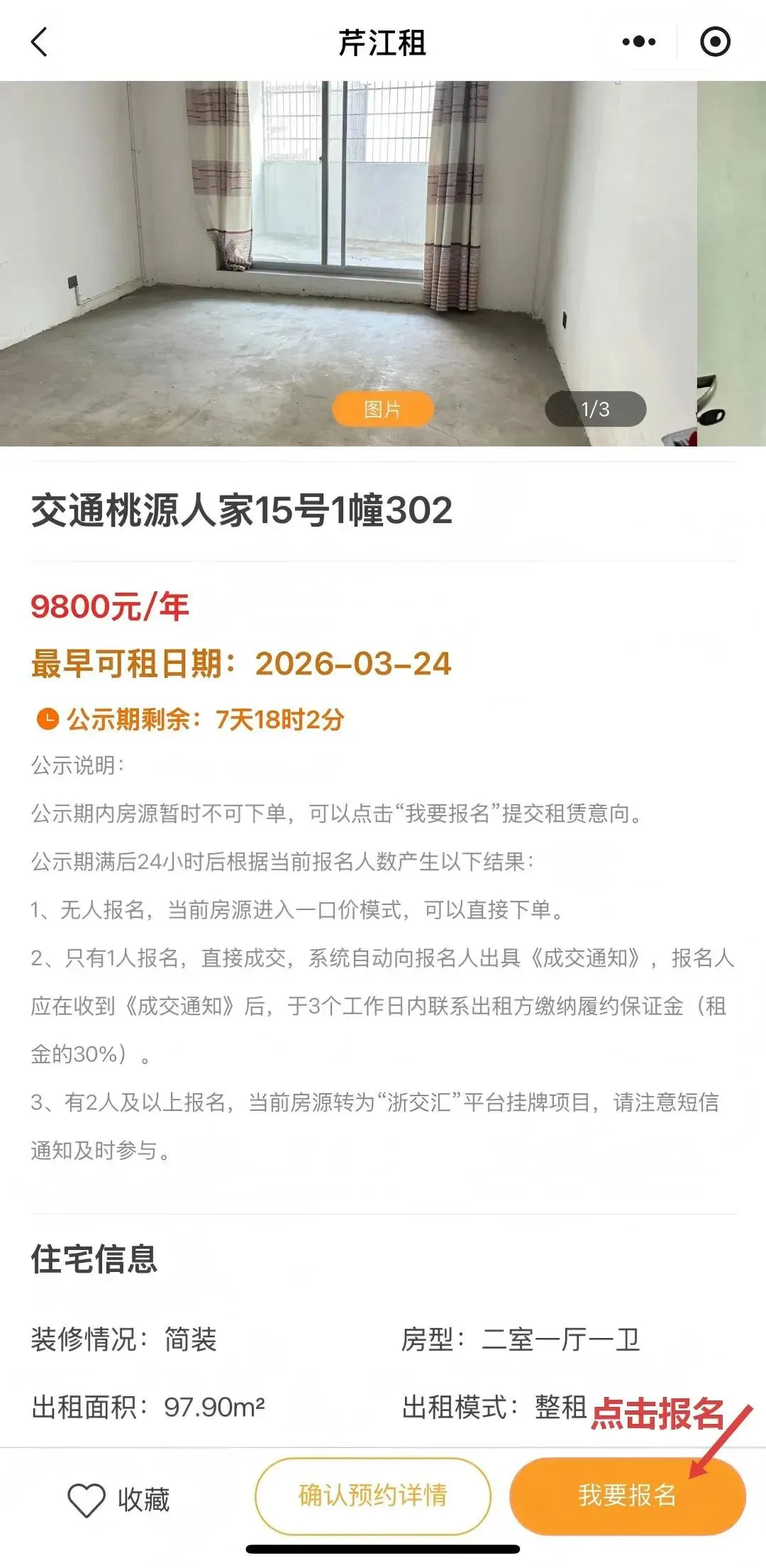 2.选择意向资产:①点击“预约看房”一填写基础信息一提交预约;②点击“我要报名”一填写基础信息一提交报名一报名审核一结果公示一签订合同(线下)。