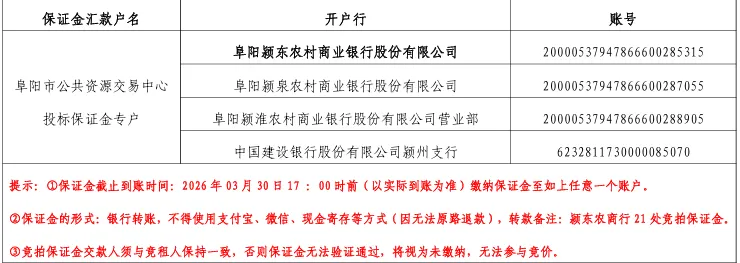 3. 注意事项:意向竞租人须在2026年03月30日 17:00时前通过“阜阳市公共资源交易网(https://jyzx.fy.gov.cn/)”完成登录、主题库信息登记、缴纳竞拍保证金、提交报名资料(按阜阳市公共资源交易中心网站发布的《竞租须知》中第五条要求提交)等手续,待报名资料经委托方审核通过且保证金按规定的时间实时到账后,方能获得竞价资格,逾期不予审核(包括但不限于因竞租人所提交资料不符合《竞租须知》第五条中要求或规定而被退回的)。