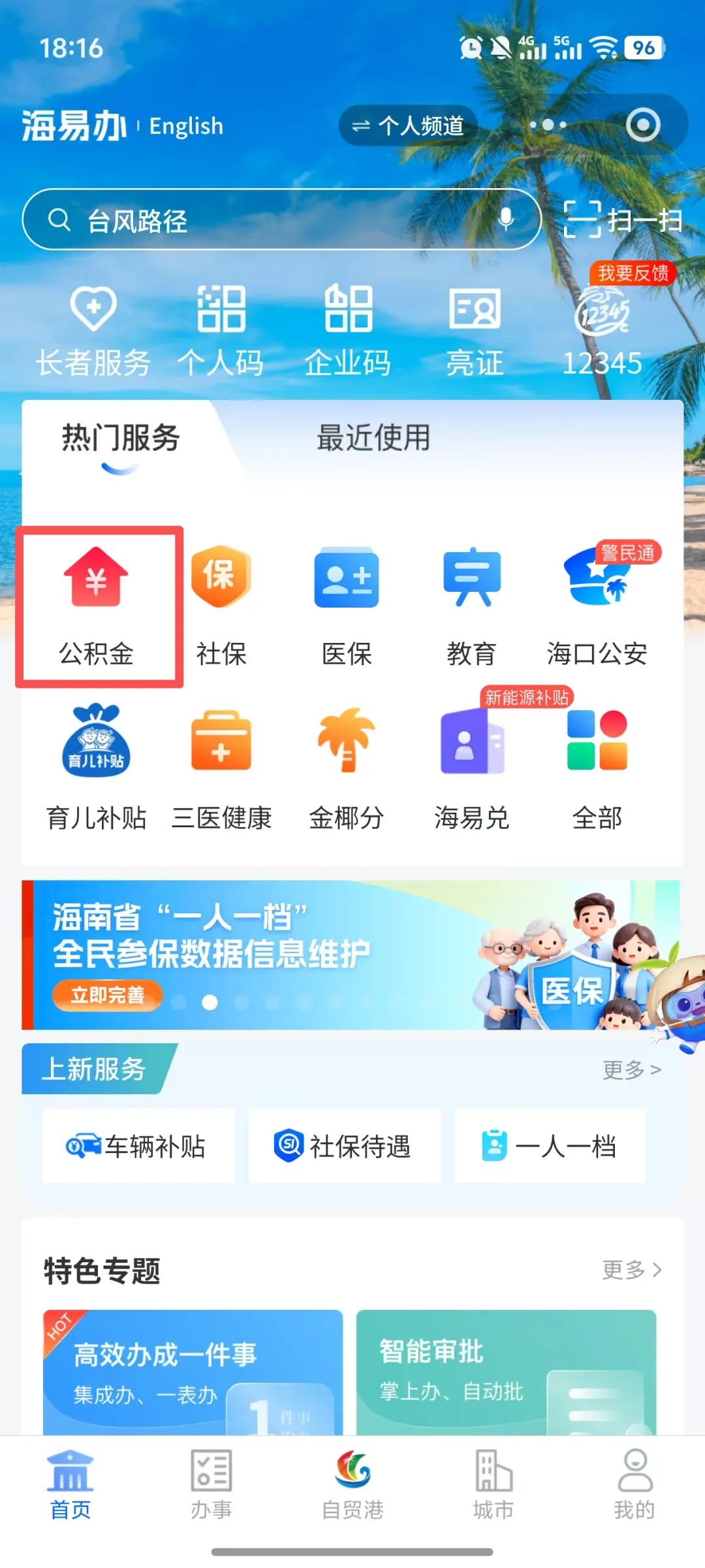 1、打开【海易办】app/小程序,打开后在首页点击【公积金】;