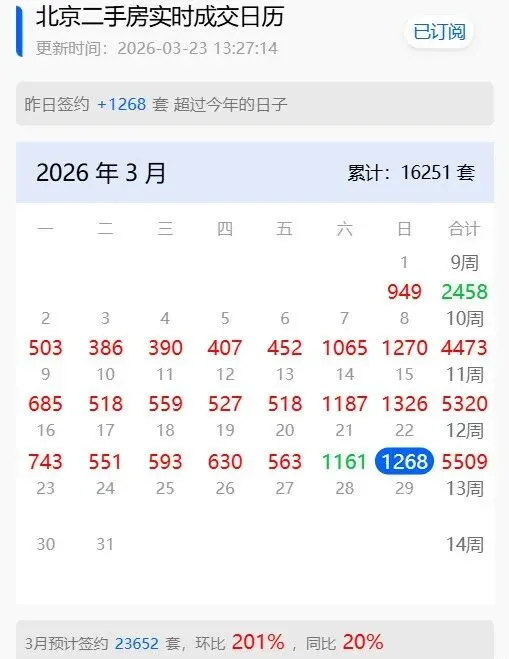 截至3月21日,北京3月已经卖了16251套,预计全月实时成交能到2.3万套。
