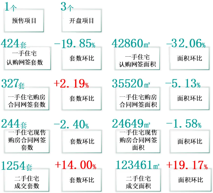 总成交量:商品房成交366套,环比↑4.87%,其中住宅成交327套,环比↑2.19%