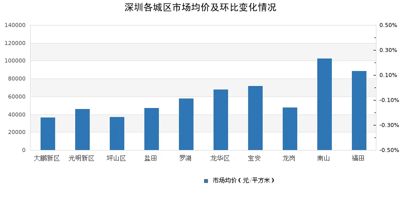 深圳0城区市场均价下跌,0城区环比上涨。从城市涨跌幅情况来看,