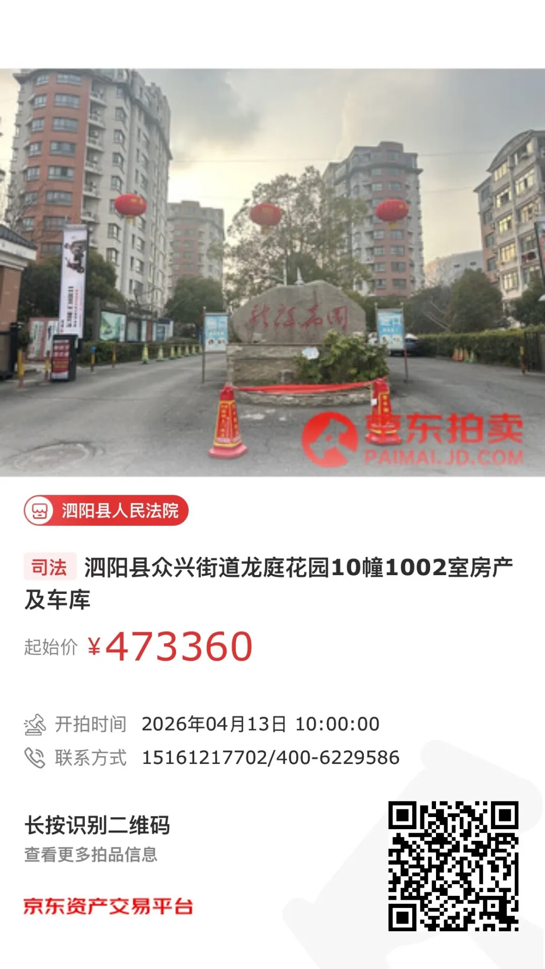 拍品信息:泗阳县众兴街道龙庭花园10幢1002室房产及车库(第一次拍卖)
