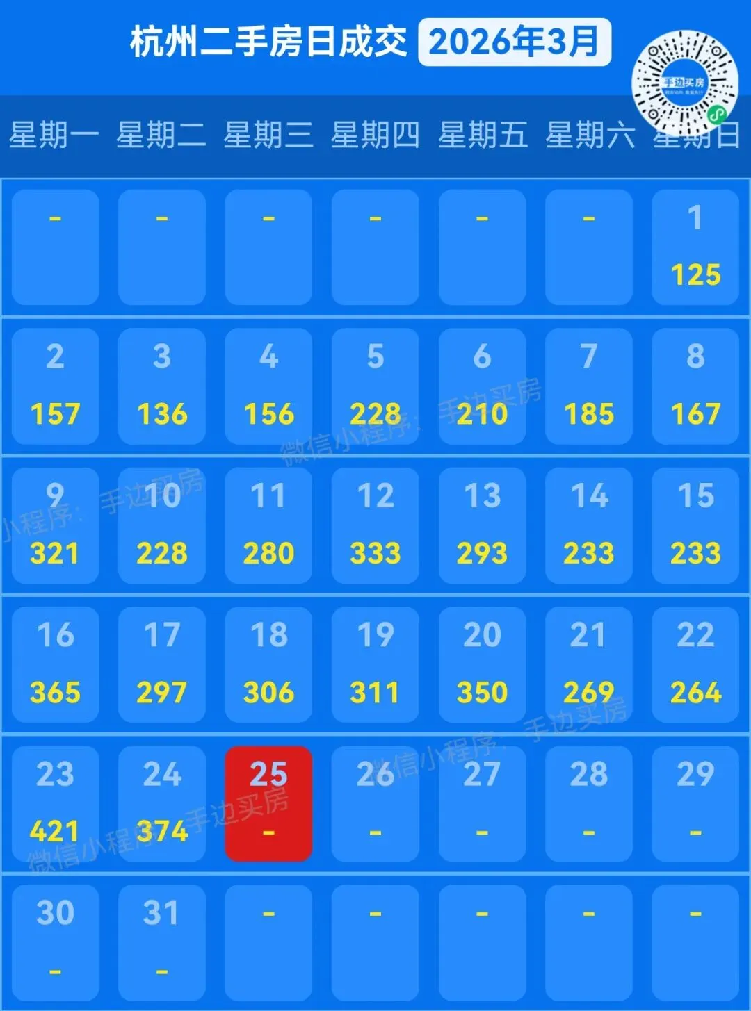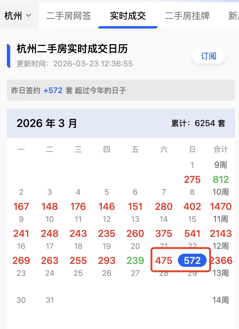 这个数字,仅次于前天的421套,是今年二手房日网签的第二高。不过,萧山、临安因为周末休息,因而合并到周一一起网签。因此,昨天的374套,事实上刷新了今年二手房网签量新高!春节过后,进入三月,杭州二手房小阳春行情热度上升趋势非常明显。从3月2日首个完整周算起,从第一周的1470套,到第二周的2143套,再到第三周的2366套,预定量持续攀升。上个周末,杭州二手房新增预定,更是首度突破了1000套大关,达1047套。按照这个趋势,这个月杭州二手房的实际成交量(按预定口径),很可能会接近甚至突破万套大关。 03