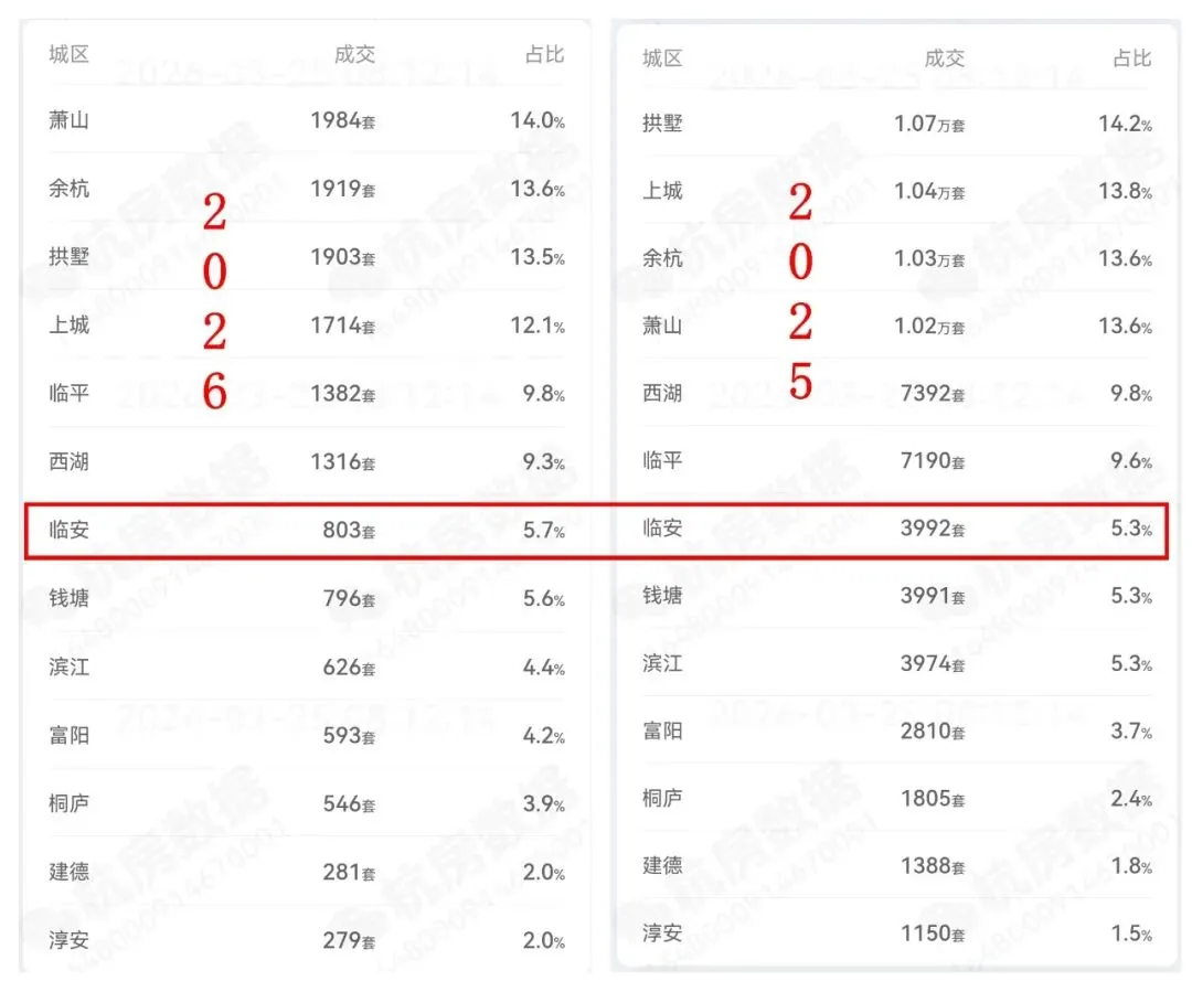 杭州2025、2026年(截止3月24日)二手房成交对比(来源:杭房数据)这是杭州2025、2026年(截止3月24日)二手房成交对比。1,萧山、余杭超越拱墅、上城,成为二手房成交的前两名。4,同样,钱塘、富阳、桐庐、建德、淳安排名没变,但在总成交中的占比全部增加了。5,滨江、西湖、上城、拱墅,杭州传统的四大中心城区,成交占比一律下降。单个区域成交占比变化或有偶然因素,但中心城区成交占比全部下降,非中心城区成交占比全部上升,那反应的绝对就是趋势。 04