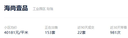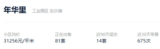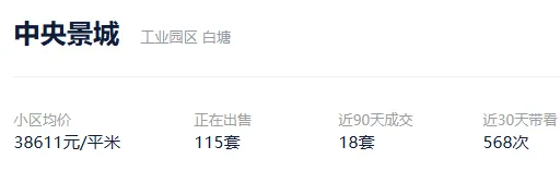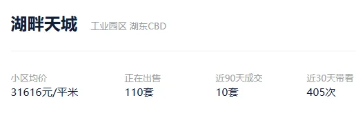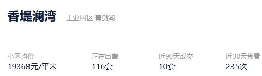 根据贝壳数据显示,2026年1月1日以来,工业园区成交了724套二手住房,涉及了16个板块的249个社区及组团,套均成交面积111.99平,平均挂牌单套总价336万元,挂牌单价29996元/平,平均成交周期258天。
