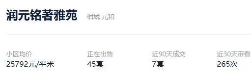 根据贝壳信息显示,润元铭著雅苑目前45套挂牌出售,挂牌均价25792元/平。