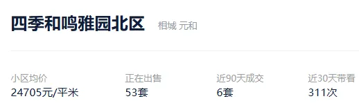根据贝壳信息显示,四季和鸣雅园北区目前53套挂牌出售,挂牌均价24705元/平。
