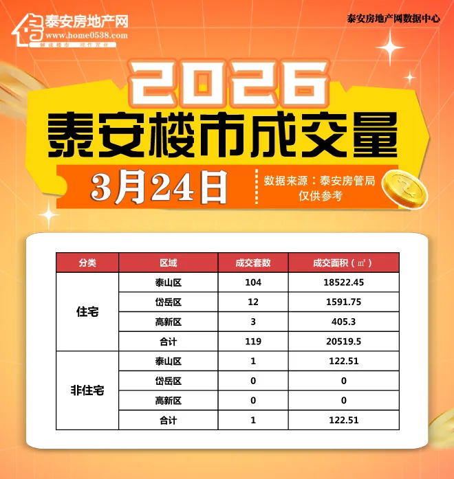 【泰安房地产网讯】据本站不完全统计,2026年3月24日泰安市共成交商品房120套,其中住宅网签119套,总面积20519.5㎡,办公、商业网签1套,总面积122.51㎡,与3月23日相比环比上涨566.67%。