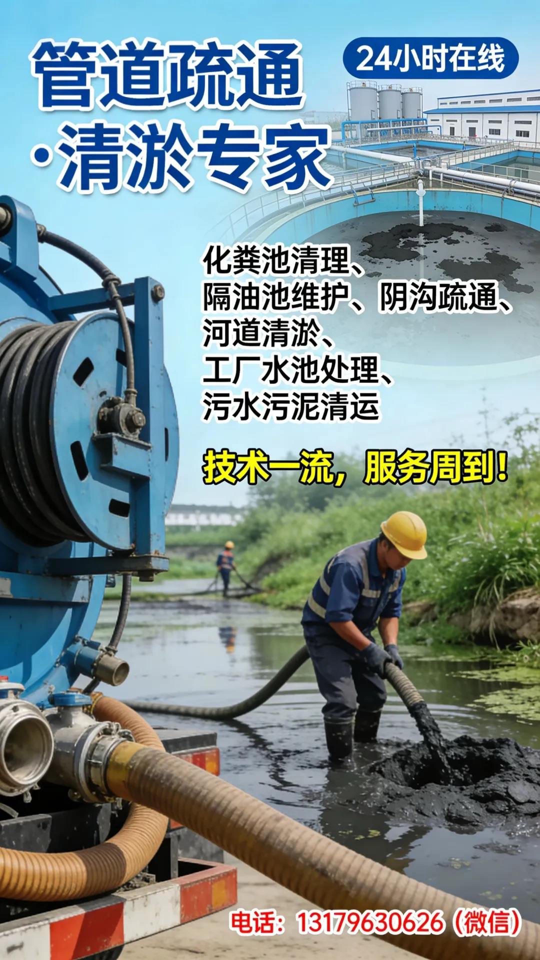 【宣传】管道疏通,化粪池,隔油池,阴沟,河道清淤,工厂水池,污水污泥,24小时在线,技术一流,服务周到!
