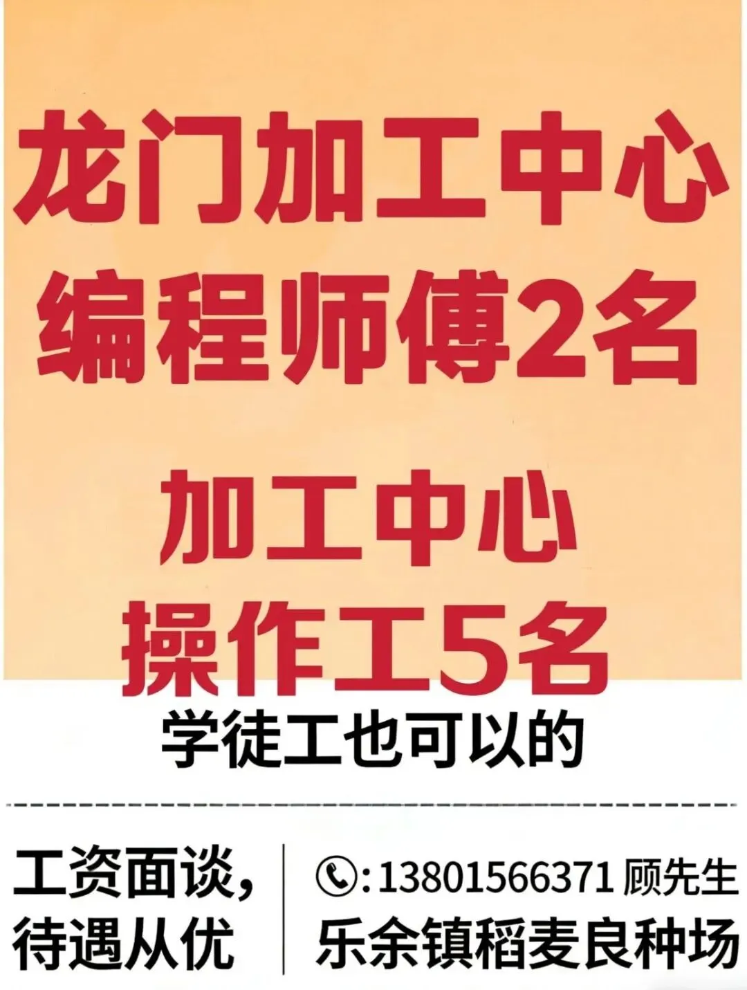 ❸、CNC加工中心操作工1名。熟练优先,学徒也可以