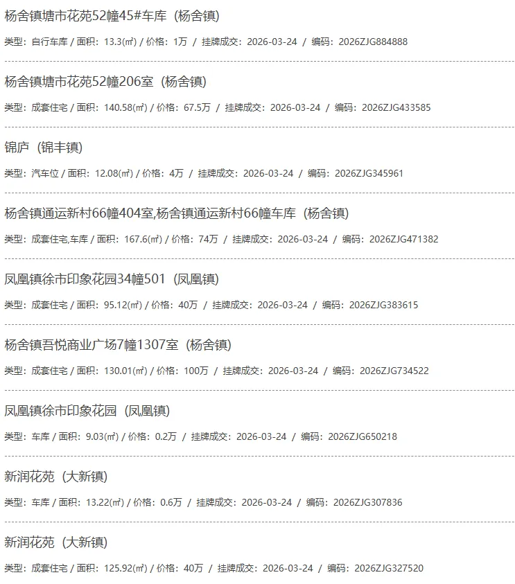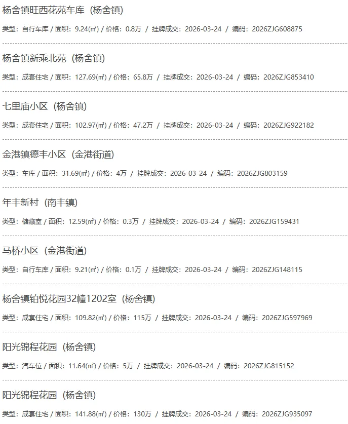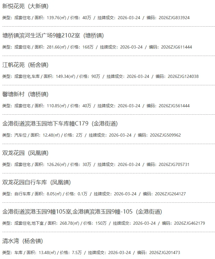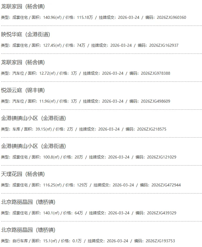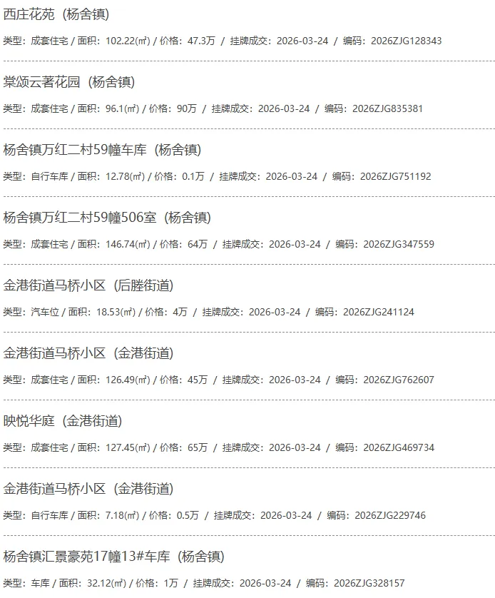 根据张家港房产网(www.zjgzf.cn)整理,(2026-03-24至2026-03-24)总共92套二手房网签挂牌成交(含自行车库及汽车库),数据根据住建局官方网签平台整理,并已同步至各对应小区的成交明细,特别提醒:此处数据及各小区成交数据中凡标注(来自网签挂牌)的,均是根据政府网签挂牌系统整理,价格可能不准,请谨慎采信;并仅作为您买房卖房的参考而非决定依据。以下为数据明细: