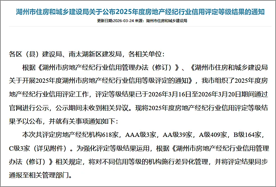 根据《湖州市房地产经纪行业信用管理办法(修订)》、《湖州市住房和城乡建设局关于开展2025年度湖州市房地产经纪行业信用等级评定的通知》,湖州市组织了2025年度房地产经纪行业信用评定工作,评定等级结果已于2026年3月16日至2026年3月20日期间通过官网进行公示,公示期间未收到相关异议。现将2025年度房地产经纪行业信用评定等级结果予以公布,并就有关事项通知如下: