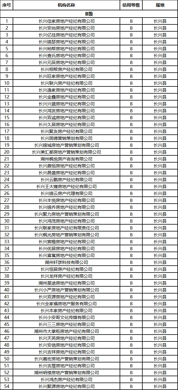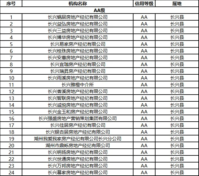 其中,长兴县共24家房地产经纪机构评定为AA级,54家房地产经纪机构评定为B级。