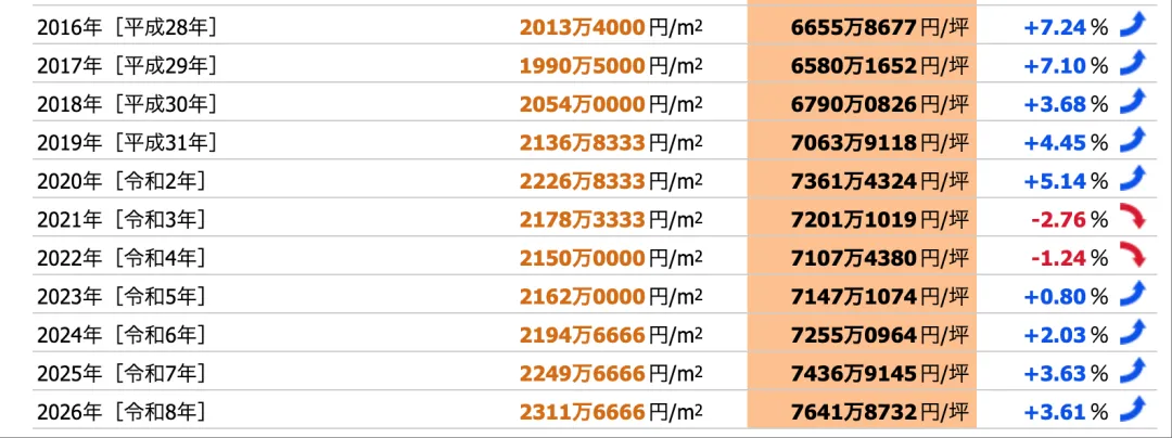 首先日本房产近十年一直都是呈上升趋势的,尽管经历了汇率的变动,疫情的短暂下跌,但整体来说还是涨价非常猛,我随便拿一个地价的上涨趋势就能看出来。