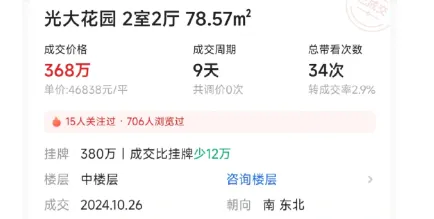 海珠光大花园,成交周期9天,只被买家砍了12万,在现在的楼市实属罕见。