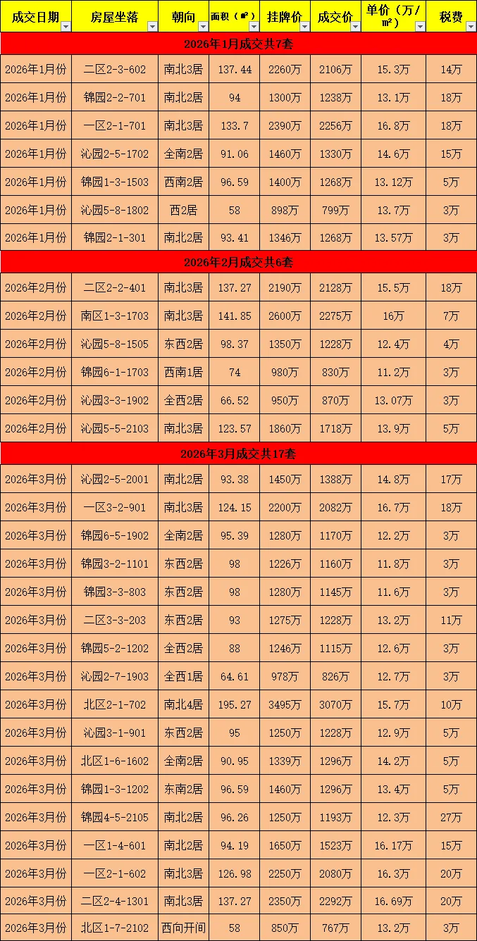 - 刚需户型:2居户型占比最高(1-3月共21套),单价集中在12-14万/㎡,是市场主流成交类型。