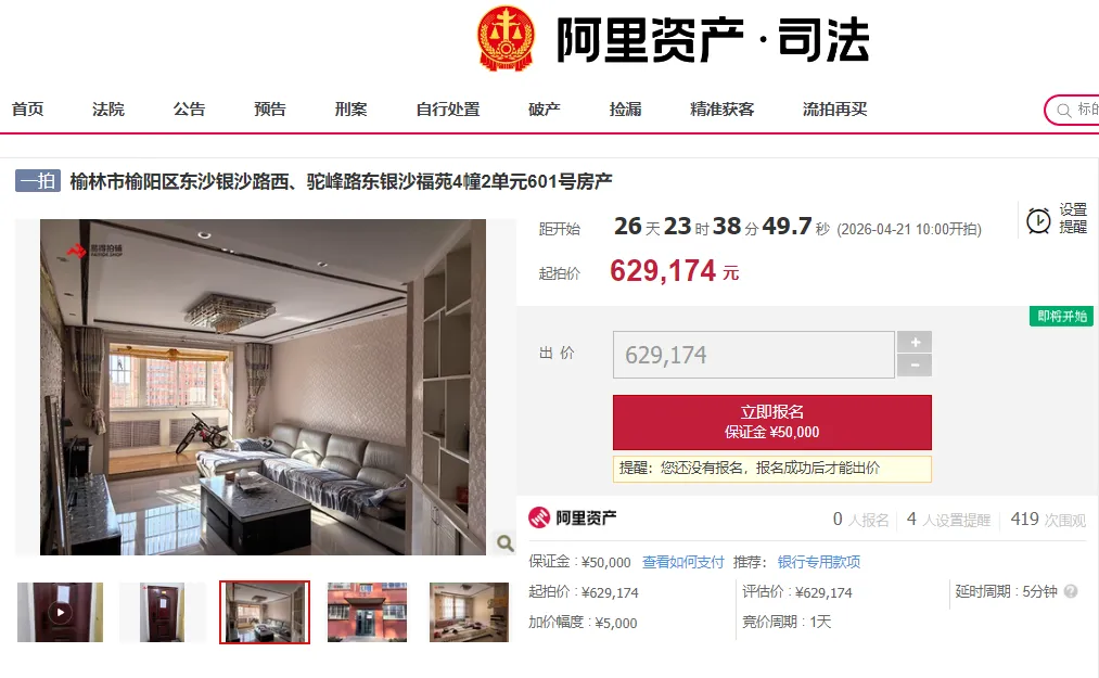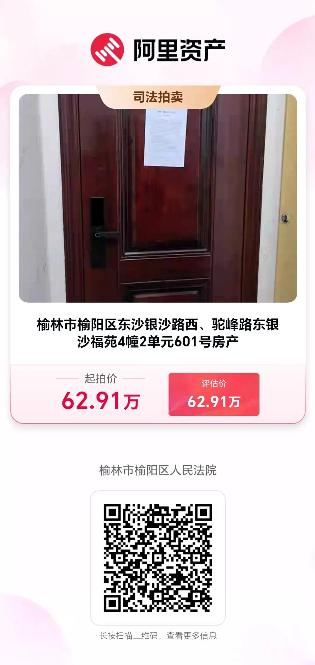 4月21日10时至22日10时,榆阳法院将在淘宝网司法拍卖平台上,拍卖榆阳区银沙福苑房产,63万元起拍!